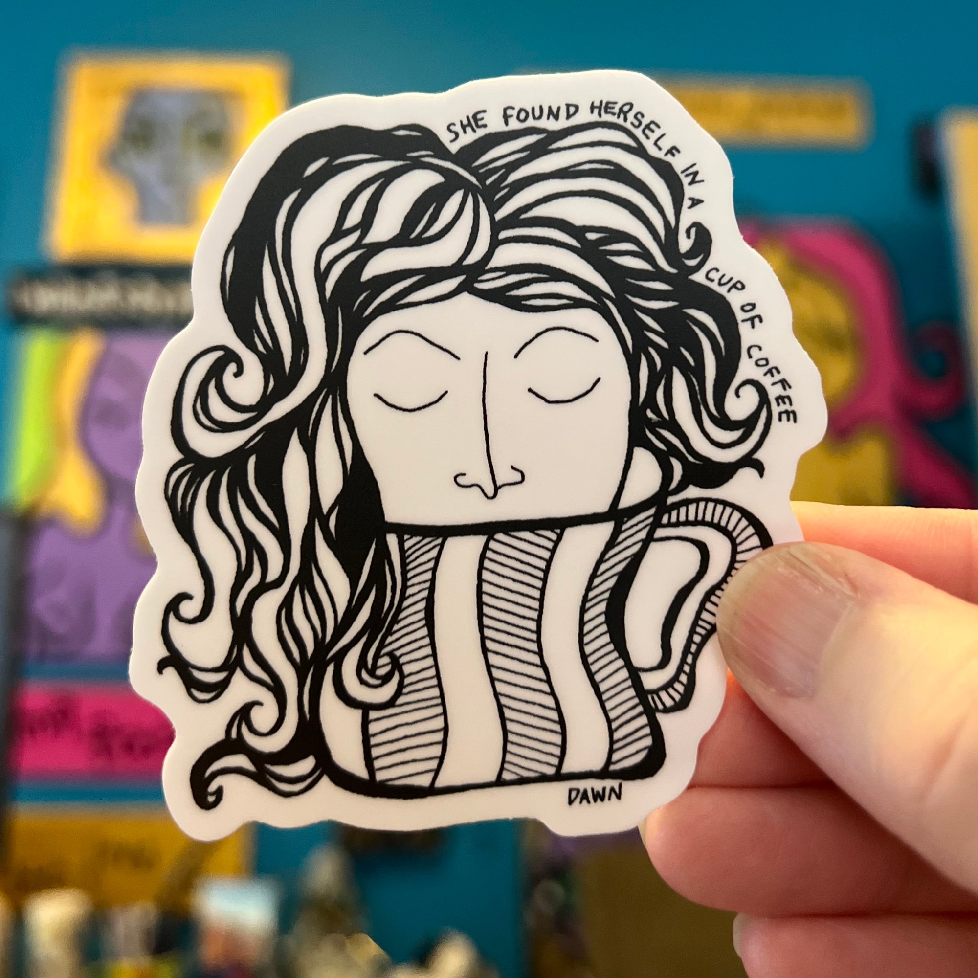 3" sticker "she found herself in a cup of coffee" small batch laminated vinyl made in portland, oregon USA reproduction of an original pen + ink drawing weather + scratch resistant good for use on water bottles, laptops, cars, etc free shipping